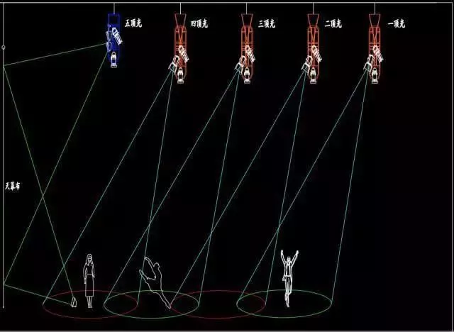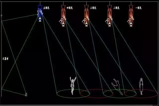 頂光是從上向下垂直投射的光線,不適于照射人物。這種光位,如使用散光燈具加柔光紙或紗,成為柔光,給景物以普遍照明,可起到“底子光”的作用。它能給景片、道具、地面均勻的亮度,并能適當(dāng)?shù)販p弱或消除其它光位的光所形成的雜亂的影子。通常在舞臺(tái)吊桿中縱深每隔3m左右設(shè)置一道燈光專(zhuān)用吊桿,電源從舞臺(tái)天棚下垂,吊桿中部設(shè)有容納電纜的線筐,燈具吊掛在吊桿下方。大幕后頂部的聚光燈具,一般裝在可升降的燈光渡橋及燈光專(zhuān)用吊桿上,主要投射于舞臺(tái)中、后部表演區(qū)。沿臺(tái)口檐幕向臺(tái)后順序安裝在吊桿上的燈為一頂光、二頂光、三頂光等。其中,臺(tái)口頂光位于建筑臺(tái)口上沿,緊靠大幕后的燈位,亦稱“一頂光”、“假臺(tái)口頂光”?;静脊鈶?yīng)與面光銜接。布光方法也應(yīng)與面光統(tǒng)一。該燈位還兼顧表演區(qū)特殊照明,如重點(diǎn)光、特技光、追光等。樂(lè)池頂光,位于樂(lè)池頂部自上向下垂直照射,作為樂(lè)池升起后,大幕前的舞臺(tái)照明。